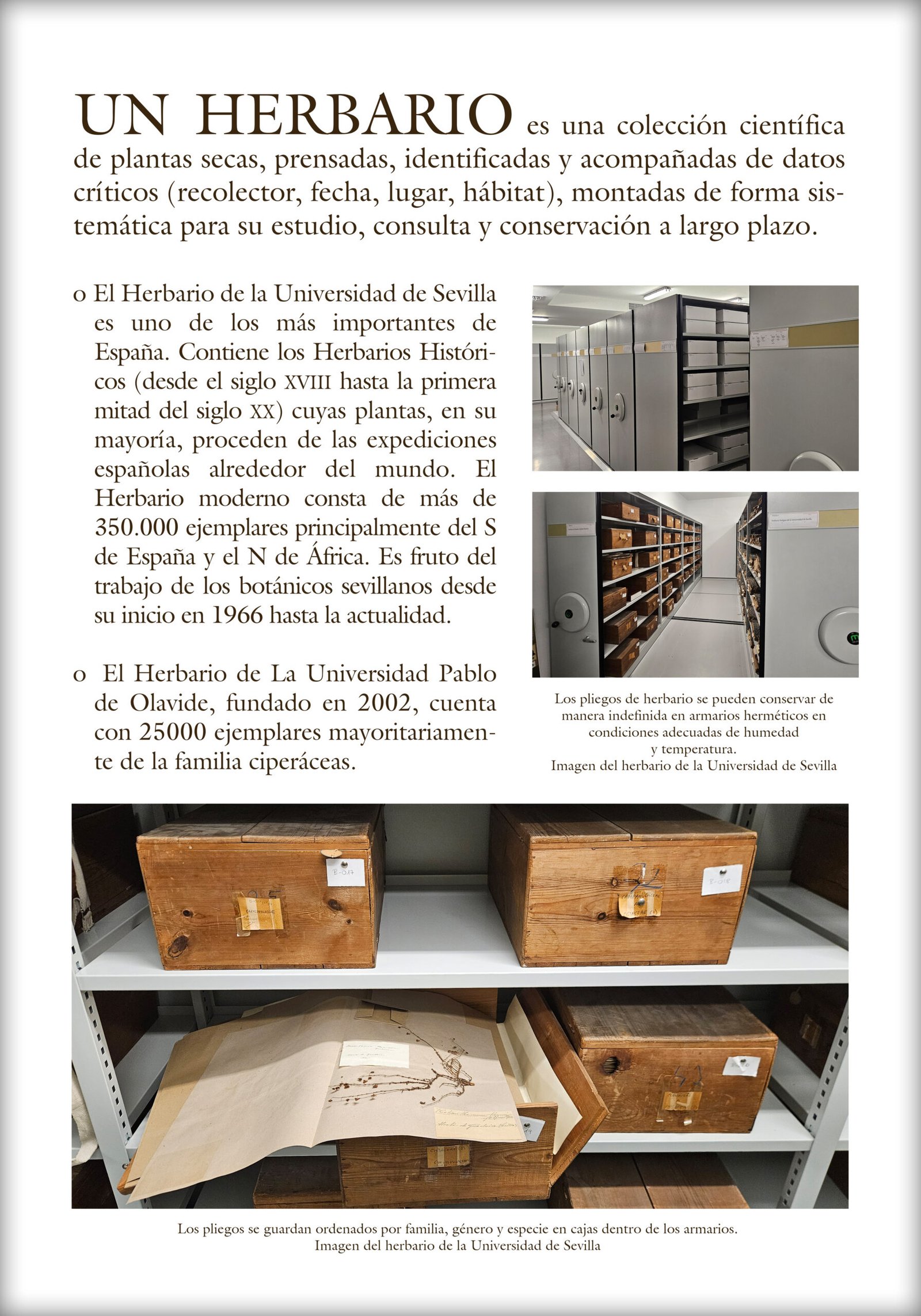 Esta exposición propone un acercamiento al valor científico y patrimonial de los herbarios. En ella se describe qué es un Herbario, sus métodos de trabajo y sus usos en la actualidad. En Sevilla contamos con el Herbario de la Universidad de Sevilla (SEV), uno de los más importantes de España, – que contiene los Herbarios Históricos (desde el siglo XVIII hasta la primera mitad del siglo XX), y el Herbario moderno, que consta de más de 350.000 ejemplares principalmente del sur de España y el norte de África-; y El Herbario de La Universidad Pablo de Olavide (UPOS), que fundado en 2002 actualmente cuenta con 25.000 ejemplares.