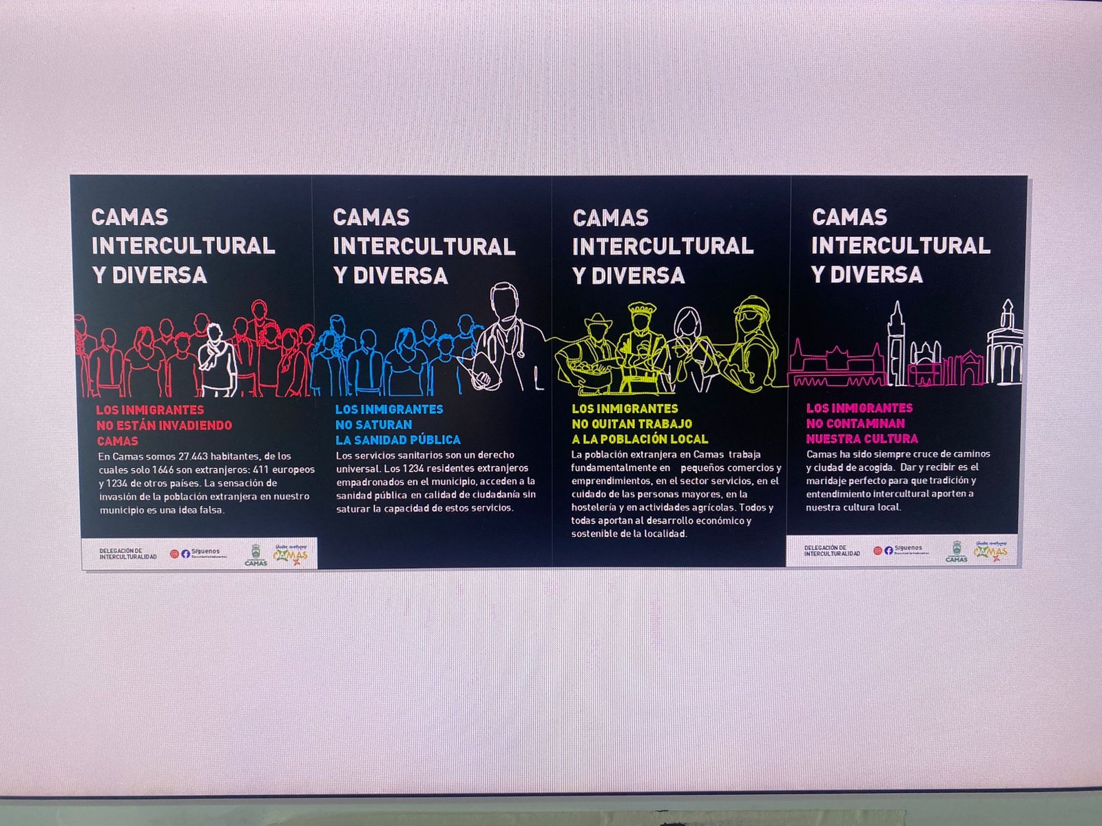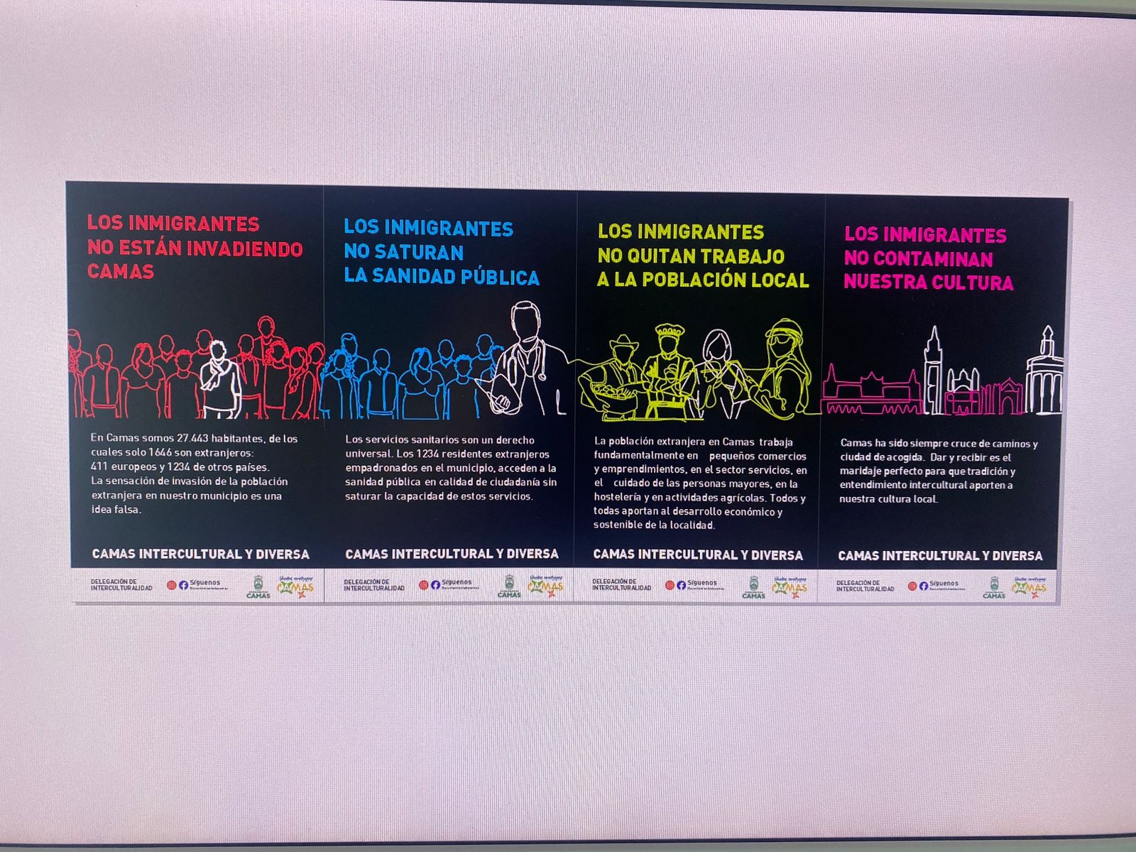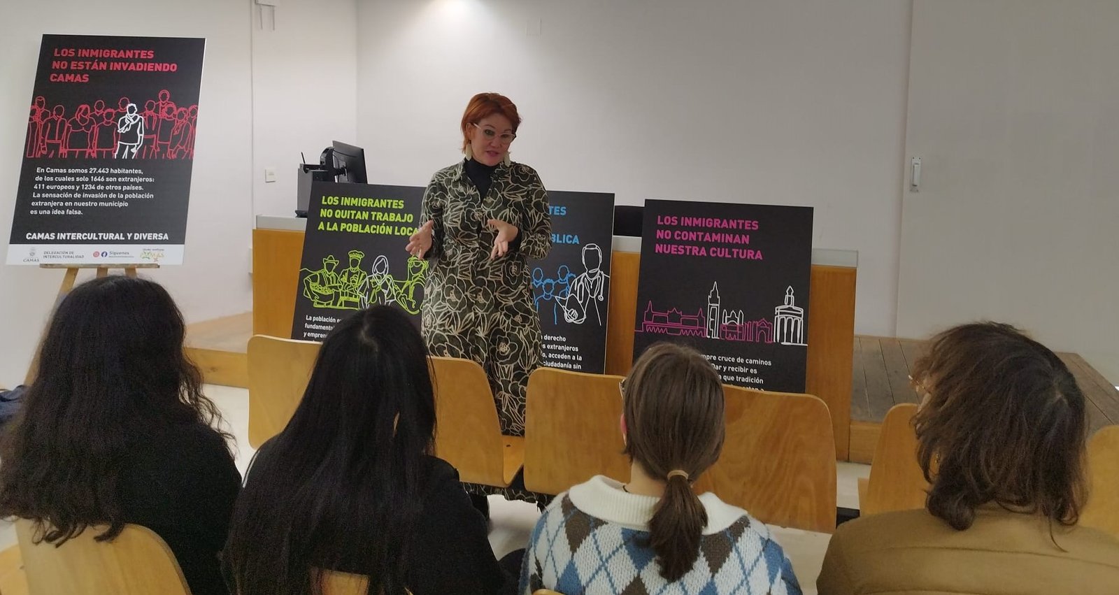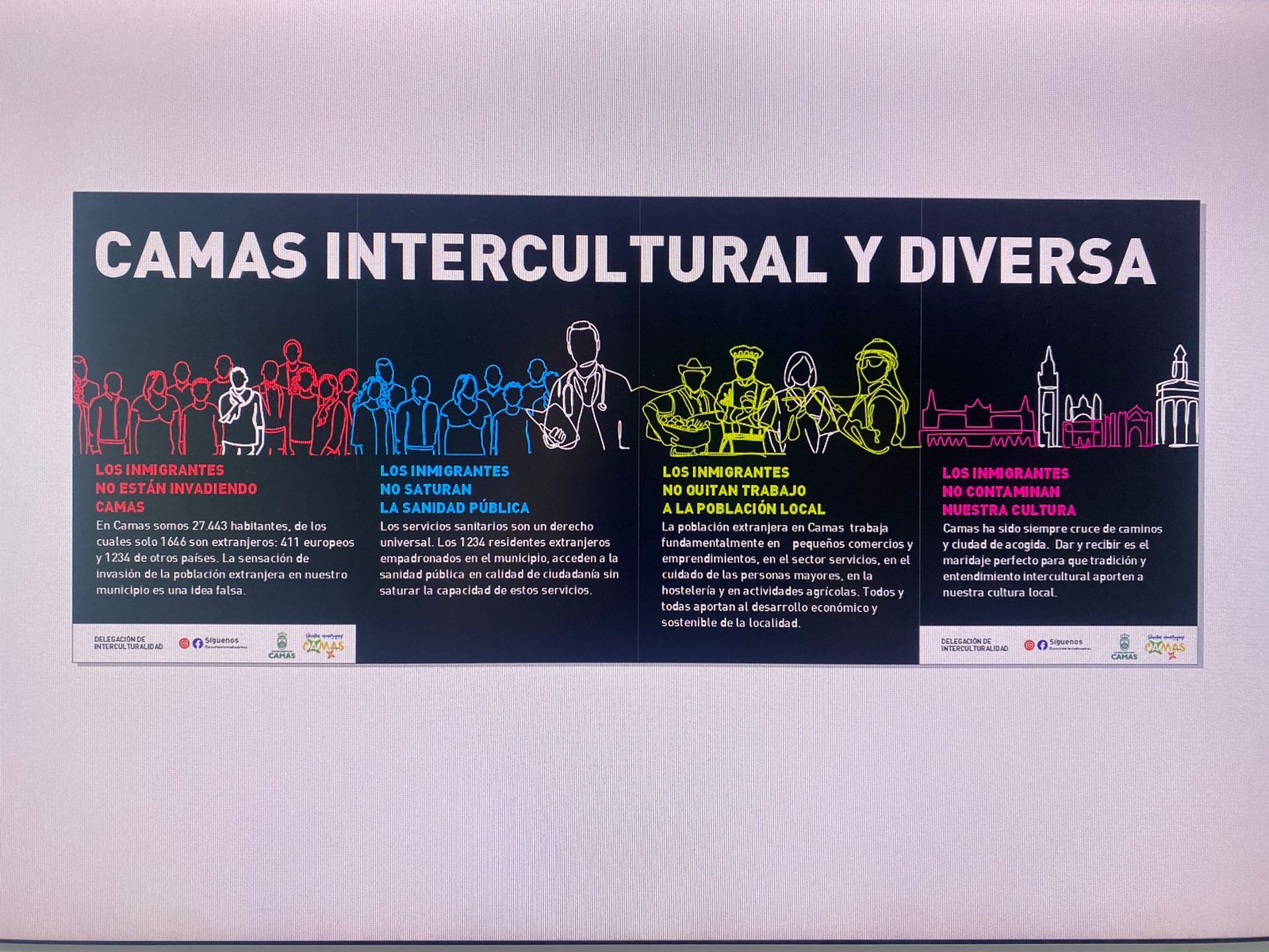 Por otro lado, se trascendió el argumento de las cifras a favor de argumentos basados en el respeto de la población migrante y en los Derechos Humanos. En primer lugar se orientó el trabajo hacia la sensibilización de toda la población del municipio de Camas sobre los efectos negativos de los bulos; se desmontaron falsas creencias que han naturalizado los bulos, se visibilizó el aporte de la población extrajera a nuestra ciudadanía no solo desde el punto de vista económico, sino también sociocultural y se formaron Corresponsales de interculturalidad en los institutos, con el fin de abordar el tema de manera adecuada.